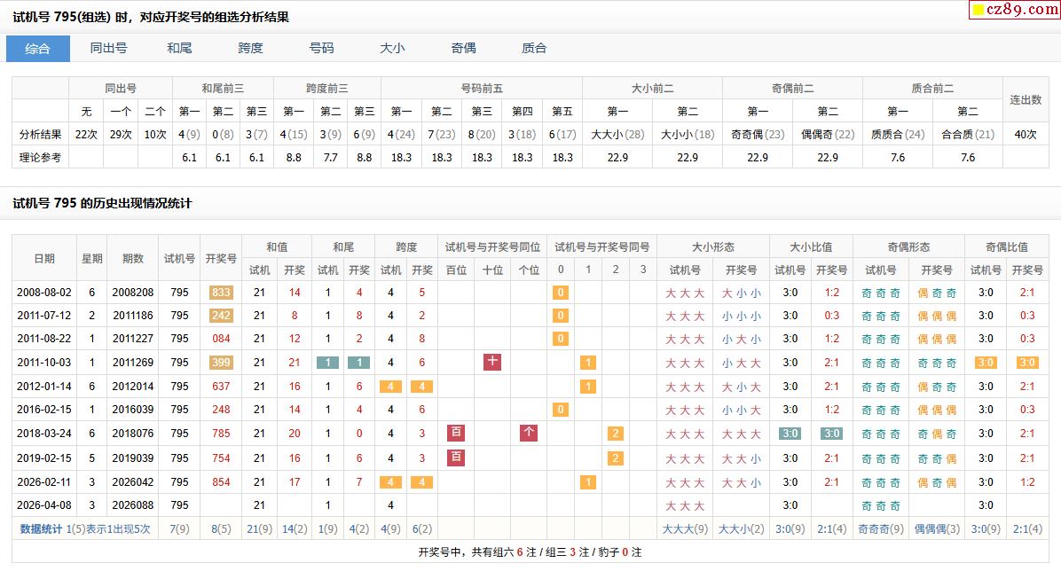 088期福彩3D试机号795对应开奖号的组选分析结果-3D试机号_今天福彩3D开机号和试机号查询_排列三开机号和试机号